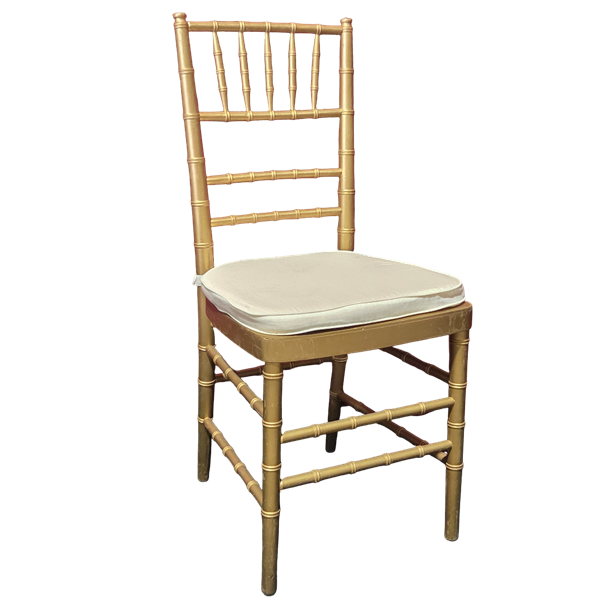 A stacking gold chair. Available with Ivory or Gold cushions.